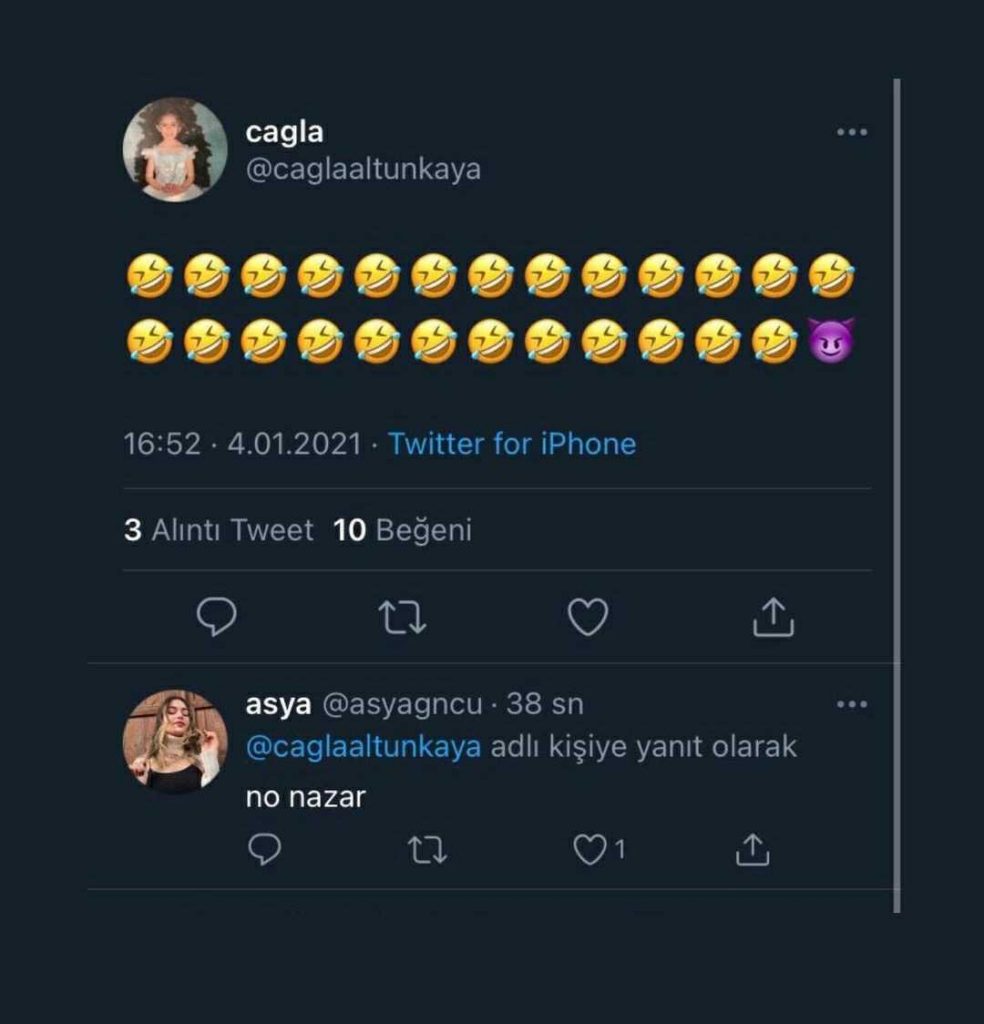 Bütün bu olaylara sessiz kalan Ayça Çağla Altunkaya’dan, Şeyma Subaşı paylaşımlarının ardından gülen emoji ve şeytan emojisi tweeti geldi! Attığı tweet kısa zamanda ortaya çıkınca, Ayça Çağla Altunkaya Twitter hesabını gizledi!