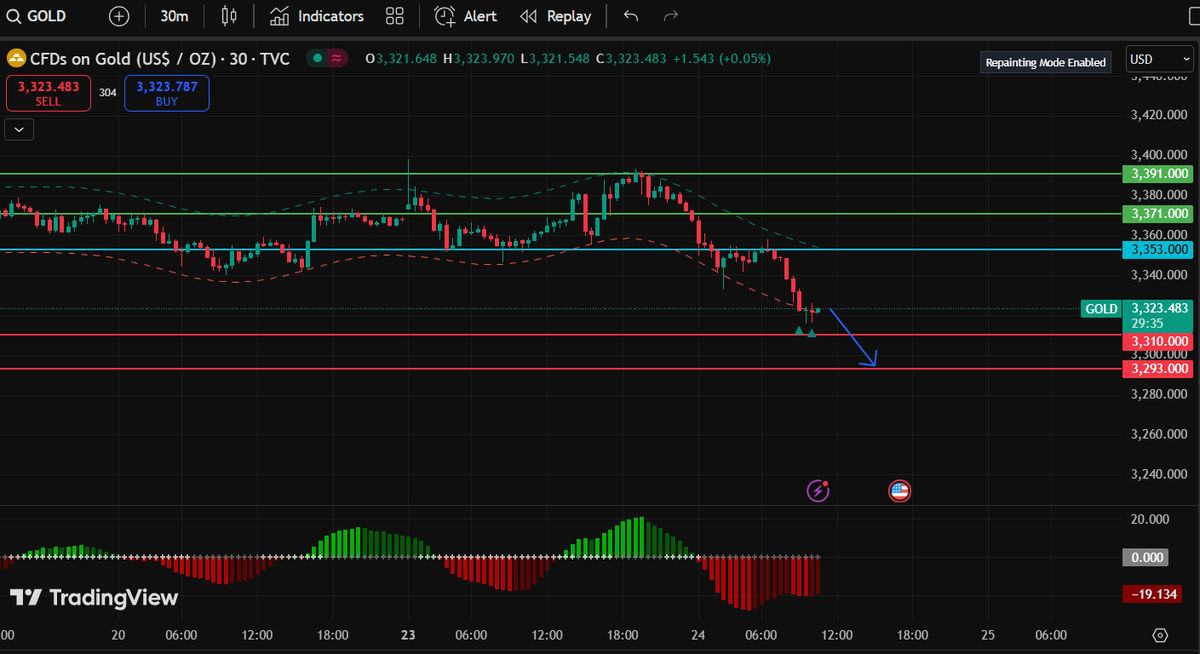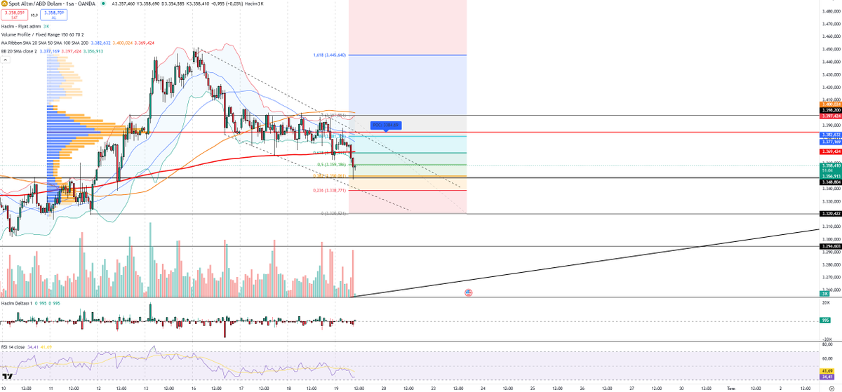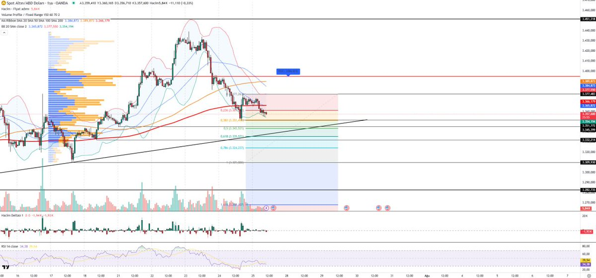- Teknik Görünüm: Saatlik grafikte RSI 34 seviyesinde aşırı satım sinyali veriyor. 200 SMA 3366 dolar direnç, Fibonacci 0.618 seviyesi 3335 dolar destek. Bollinger Bandı alt bandına yakın, tepki alımı gelebilir.
