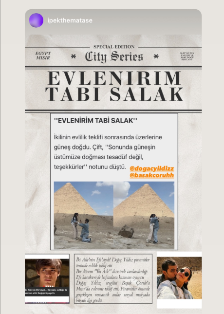 Ünlü sanatçı Doğaç Yıldız, aşk yaşadığı Başak Çoruh ile evlilik kararı aldı. Çifte kumrular, Mısır tatilinde tarihi piramitlerin büyüleyici havasında unutulmaz bir an yaşadı. Güzel çiftimiz, bu çok özel anları, takipçileriyle paylaştılar. Başak Çoruh ve Doğaç Yıldız çifti, kısa sürede beğenilerin odağı haline geldi.