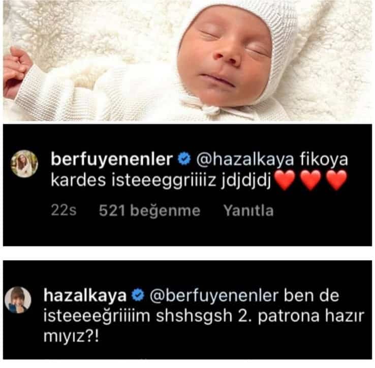 Geçtiğimiz günlerde 2. çocuğunu kucağına alan Berfu Yenenler oğlu Mete’nin fotoğrafını Instagram’dan paylaştı. Binlerce yorum ve beğeni gelen fotoğrafa Hazal Kaya’da yorum yapmadan geçmedi. “ÖLÜCEM benimkiler de hormon be kardeşim” yazan güzel oyuncu yorumuna bol bol kalp emojisi koymayı da ihmal etmedi. Hazal Kaya’nın hormon yorumuna cevap veren Berfu Yenenler “Fikoya kardeş isteriz” diyerek topu Hazal Kaya’ya attı. Hazal Kaya’nın bu yoruma cevabı ise olay oldu. ” Ben de isterim” diye yorum yapan güzel oyuncu, “2. patrona hazır mıyız?” diyerek 2. çocuğa yeşil ışık yaktı.
