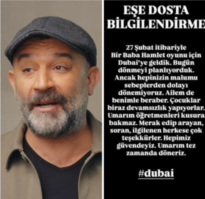 “Bir Baba Hamlet” oyunu için Dubai’de bulunan İlker Ayrık ve Şevket Çoruh, Ortadoğu’daki çatışmalar nedeniyle uçuşların iptal edilmesiyle kentte mahsur kaldı. Ailesiyle birlikte olan İlker Ayrık, sağlıklarının iyi olduğunu sosyal medyadan duyurdu ve takipçilerine “Hepimiz güvendeyiz” mesajı verdi.