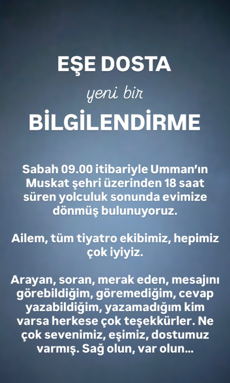 Günlerce süren belirsizliğin ardından tiyatro ekibi, Umman’ın başkenti Maskat üzerinden alternatif bir rota bularak Türkiye’ye dönebildi. 18 saat süren zorlu yolculuğun ardından sağ salim evlerine ulaşan ekibin dönüşü, sevenlerinin de içini rahatlattı.
