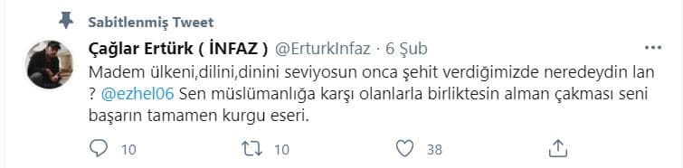 Ertürk daha sonra farklı bir tweet daha atarak, Ezhel’i eleştirmeye devam etti. Ezhel’i suçlayıcı tweetler atan Ertürk, “Madem ülkeni, dilini, dinini seviyorsun onca şehit verdiğimizde neredeydin lan? Sen, Müslümanlığa karşı olanlarla birliktesin Alman çakması seni. Başarın tamamen kurgu eseri.” demesi de dikkat çekti.