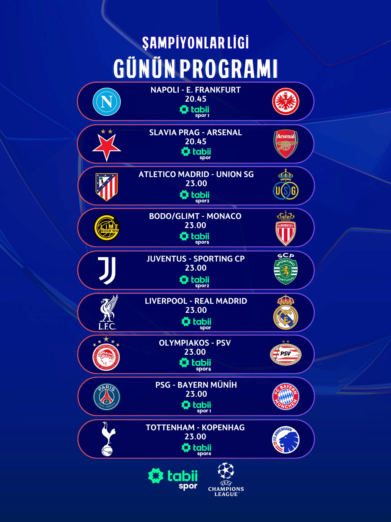 Futbolseverler için tam bir şölen sunan bu programı kaçırmamak lazım. Maç saatlerini not alın ve kanalları ayarlayın. Heyecan devam edecek.
