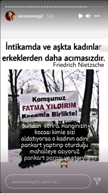 Genellikle yeni parçalarını ve mağazasını paylaşan Seren Serengil, bugün yine hasımlarına laf sokmaktan geri durmadı. Evli erkeklerle birlikte olan kadınlara bütün nefret duyan Seren Serengil şu sözleriyle herkesi şaşırttı, acaba bu atıf kime? “Bundan sonra hanginizin kocası kimle sizi aldatıyorsa o kadının adını pankart yaptırıp oturduğu mahalleye asıyoruz! Pankart parası ve story benden.”