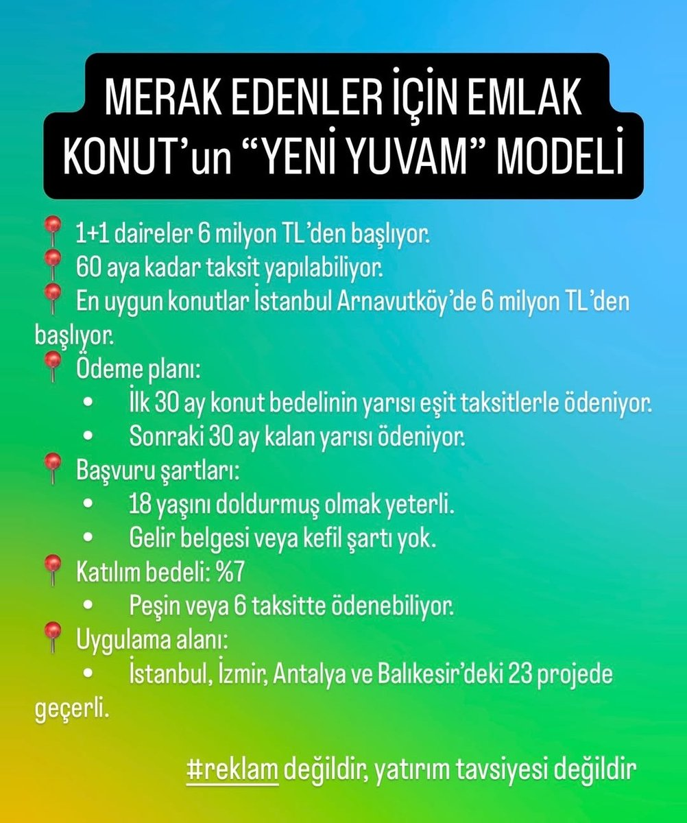 Faizsiz ve peşinatsız ödeme | Yüksek konut fiyatları (6M TL+) |