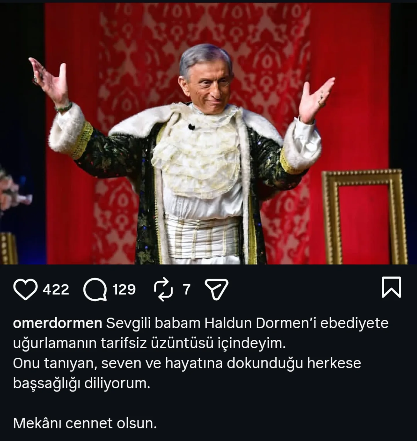 Ömer Dormen, yaptığı açıklamada babası Haldun Dormen’i kaybettiklerini belirterek, onu tanıyan ve seven herkese başsağlığı diledi. Paylaşımda cenaze törenine ilişkin detayların daha sonra duyurulacağı bilgisi de yer aldı.